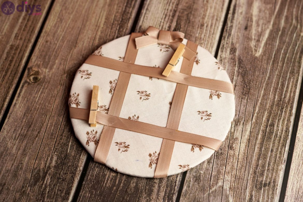Maintenant que le tableau mémo est à peu près terminé, nous devons permettre de l’accrocher au mur. Alors, obtenez le même ruban de soie que nous avons utilisé et coupez un morceau. Assurez-vous de le plier à la longueur que vous souhaitez que la planche soit accrochée à votre mur.